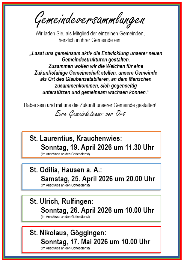 Ein herzliches Dankeschön allen Engagierten für ihre Bereitschaft zum Mitwirken und dem Pfarreirat einen guten Start, viel Freude, Erfolg und Gottes Segen für sein Wirken in der neuen Pfarrei!