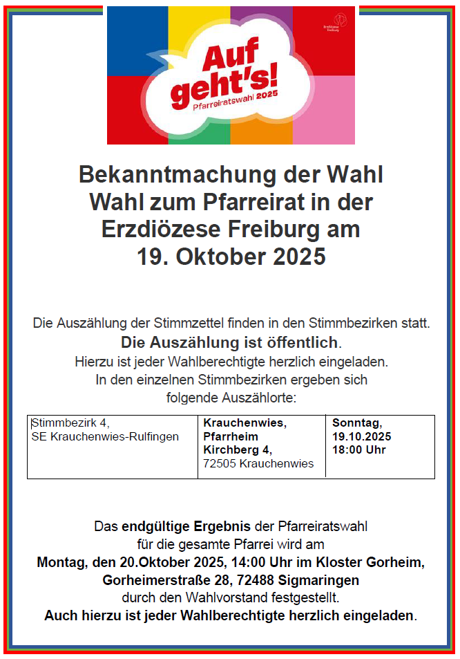 Bekanntgabe des Wahlergebnisses zur Pfarreiratswahl vom 19. Oktober 2025 – Pfarrei Herz Jesu Sigmaringen